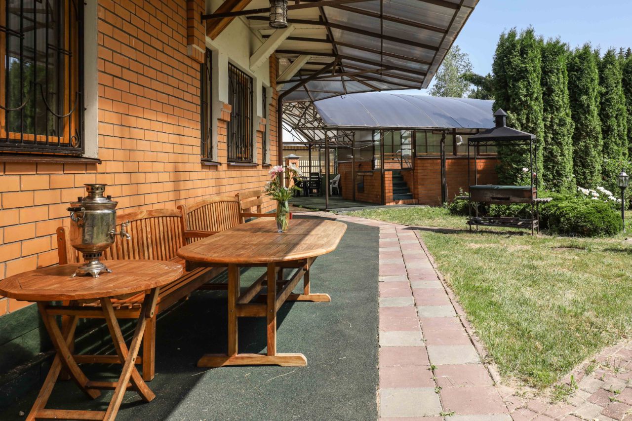 На участке размещен крытый подогреваемый бассейн 150 кв.м. В летнее время возможно открыть остекление. Отдельно расположены уютная закрытая беседка с круглым столом и креслами, оборудованная печью, коптильней и мангальным оборудованием.