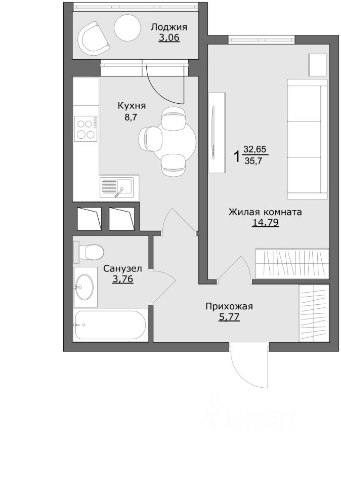 Общая площадь35,7 м2