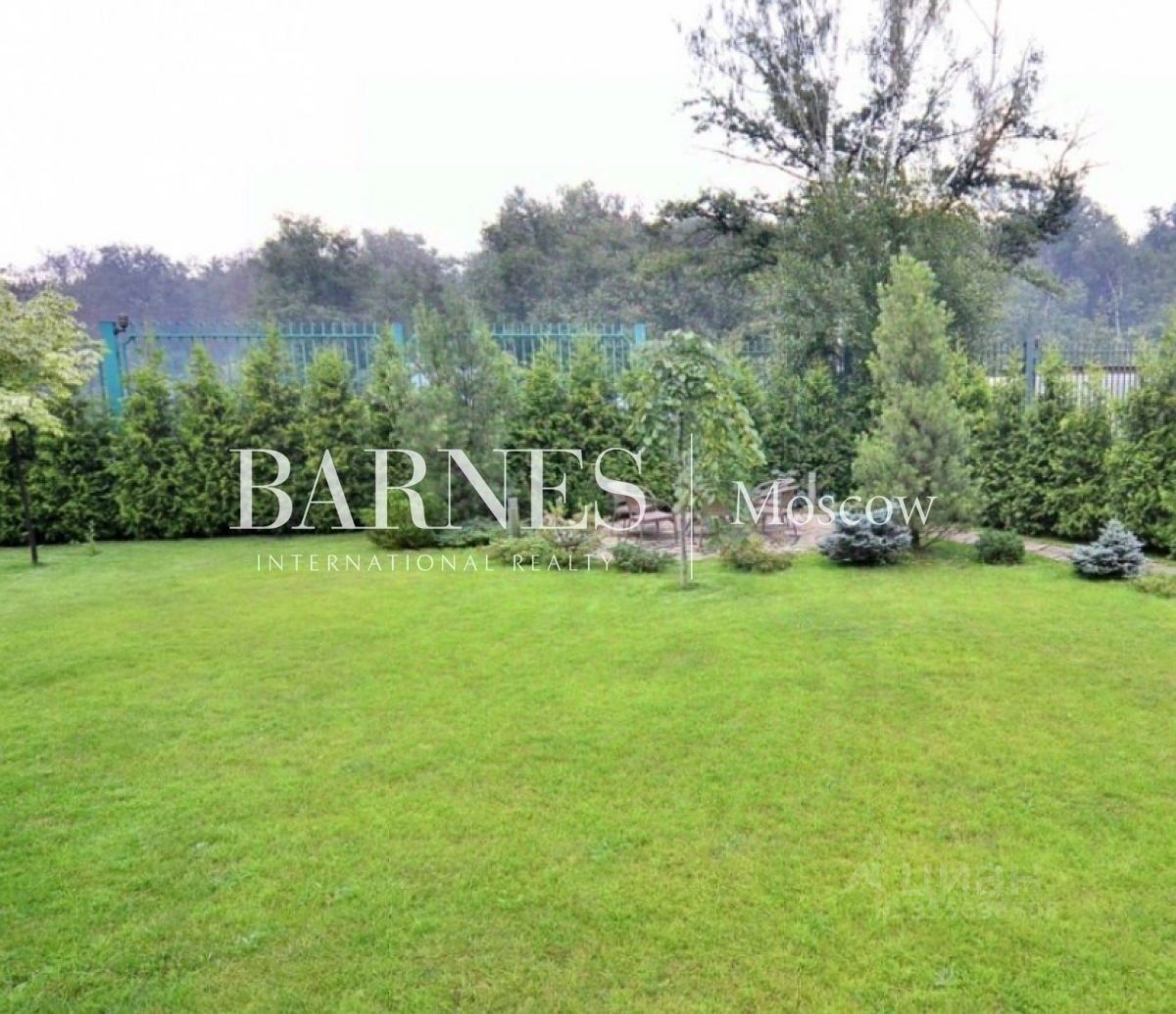 Участок ровный, правильной формы, с ландшафтным дизайном: газон, дорожки, освещение, декоративные насаждения, по периметру высажены туи, есть зона отдыха/барбекю.