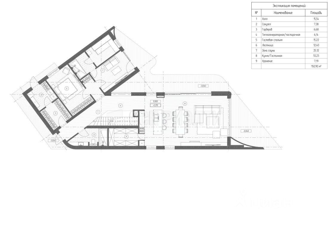 О доме: Жилая площадь: 257,1 м2. Общая площадь: 406 м2 (с учётом террас и эксплуатируемой кровли) Тщательно продуманное планировочное решение. На первом этаже: -Просторная кухня-гостиная 55м2 со своей кладовой и возможностью установки дровяного камина с выходом на террасу. - гостевая спальня или кабинет. -Продуманная прихожая с гостевым с/у, гардеробной комнатной и котельной совмещенной с постирочной. - Спа зона с комнатной отдыха, сауной и предбанником. На втором этаже: - Мастер-спальня со своим санузлом, гардеробной комнатной, балконом и великолепным видом из панорамных окон на Москва-реку - Две просторные спальни с панорамными окнами и выходом на эксплуатируемую кровлю. -Общий санузел на этаже.