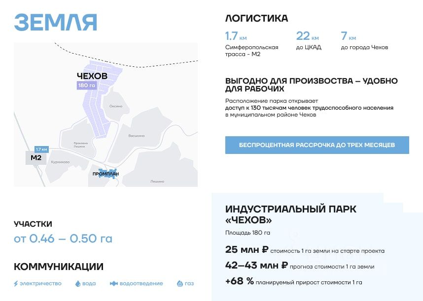 Продается участок промышленного назначения в индустриальном парке Чехов, Московская область, Чеховский городской округ. Кадастровый номер: 50:31:0060102:16 Общая площадь участка: 0,73 га. Поле ровное, сухое, не имеет заболоченных участков. Цeна за сотку: 280 000 руб. Документы на участок предоставляются по запросу. При необходимости подберем альтернативные участки в данной локации. Площадь доступных участков — от 0,4 до 50 га. Общая площадь парка Чехов: 180 га. Категория — земли промышленного назначения, разрешённое использование — производство, склады, логистика, офисно-складские комплексы. Расположение: Чехов — 7 км, Симферопольское шоссе (М2) — 1,7 км, М-4 — 20 км, МКАД — 45 км, ЦКАД — 22 км. Коммуникации: Электроснабжение: договор с Россети, подключение в течение 3 месяцев, линия по границе участка Вода: центральное водоснабжение или скважина (2026 г.) Водоотведение: центральное Газоснабжение: магистральный газ, нанесён на кадастровую карту (договор с Мособлгаз) Управляющая компания — Промплан.Сервис Мы готовы не только помочь с выбором объекта, но и подобрать программу льготного финансирования под 14,5%, а также сопроводить сделку до момента получения денежных средств.
