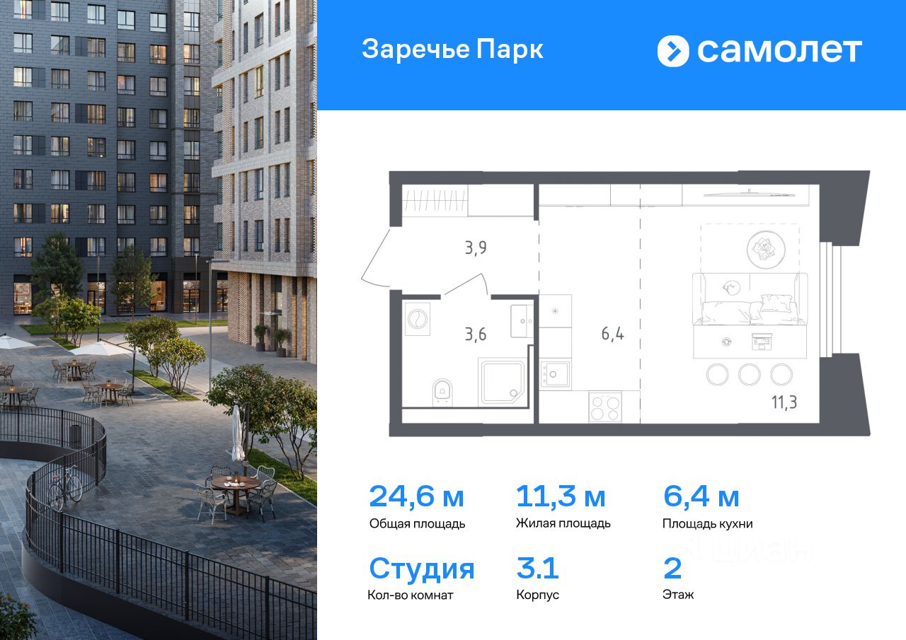Предлагается квартира студия бизнес-класса 24,6 кв.м в корпусе 3.1 на 2 этаже, в ЖК ''Заречье Парк'' Квартира с чистовой отделкой. Доступность дополнительных опций уточняйте у застройщика.