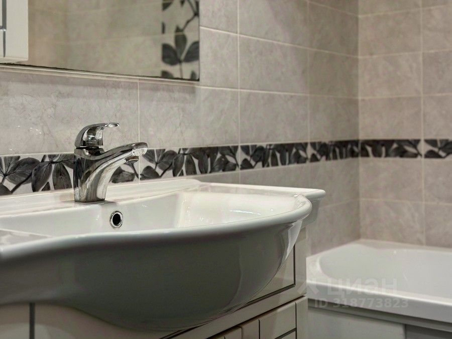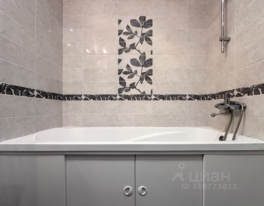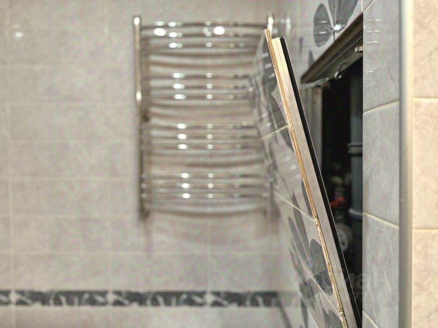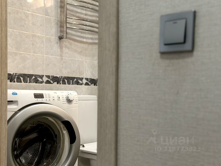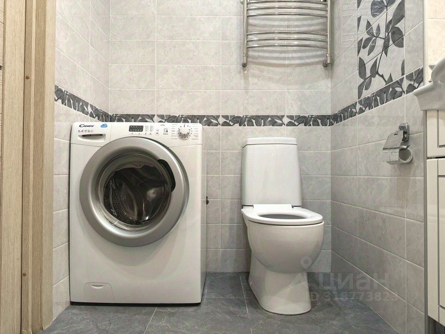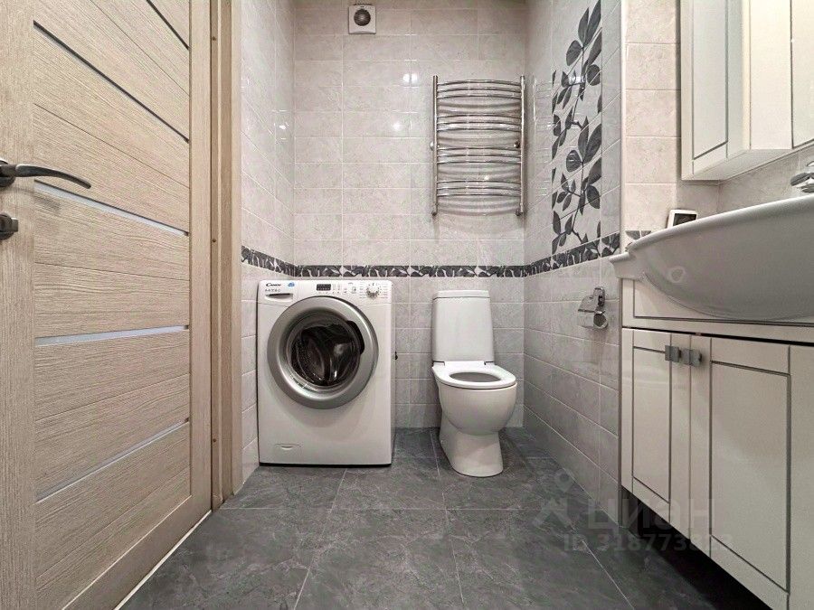 При входе, по правую руку, расположена большая гардеробная и просторный совмещенный санузел с полноценной ванной и стиральной машиной.