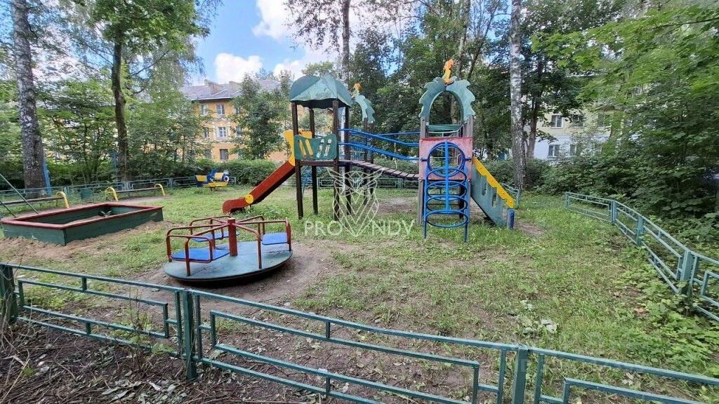 Тихий двор, густо засажен деревьями и кустарниками. Детская площадка во дворе.
