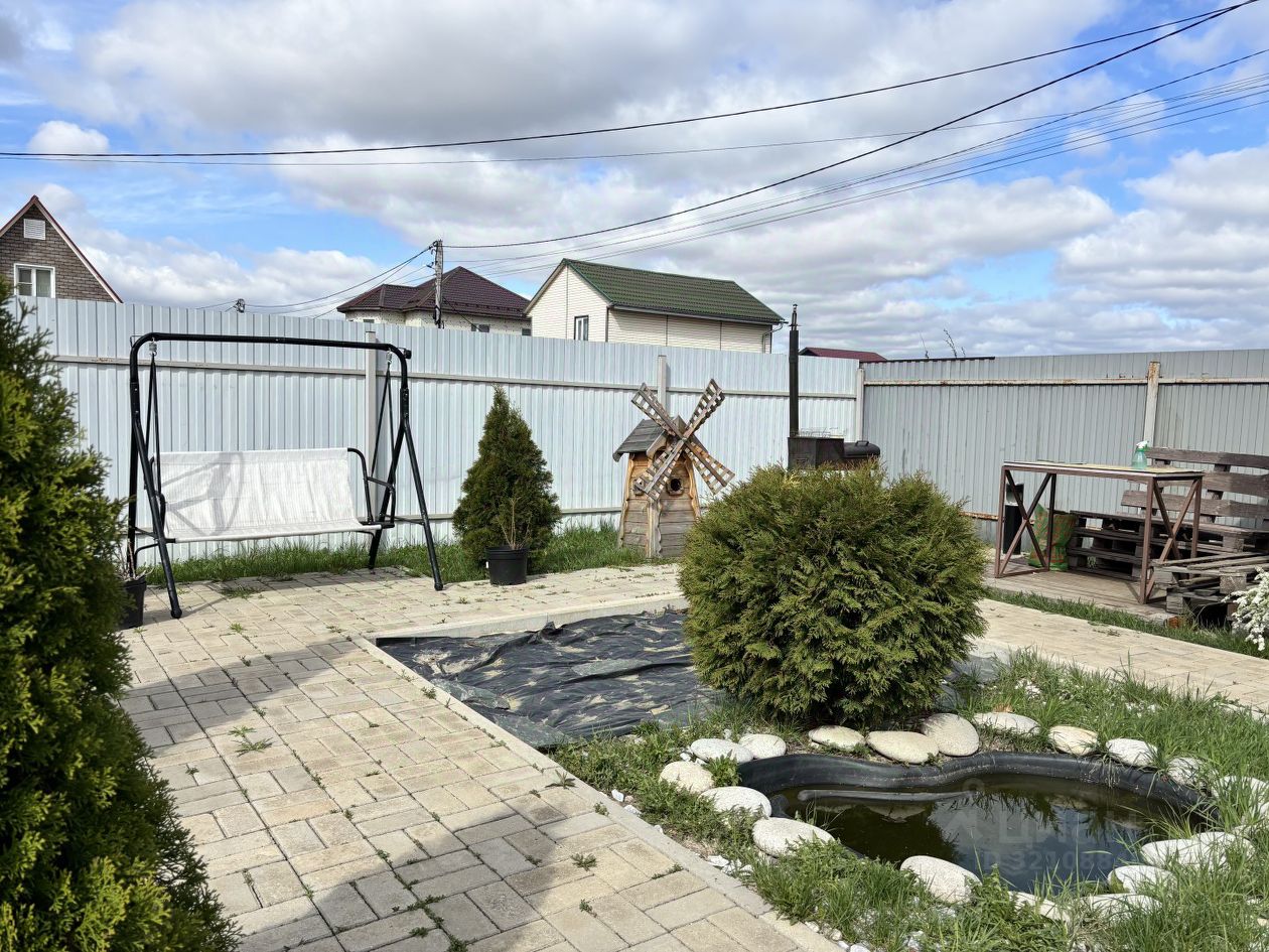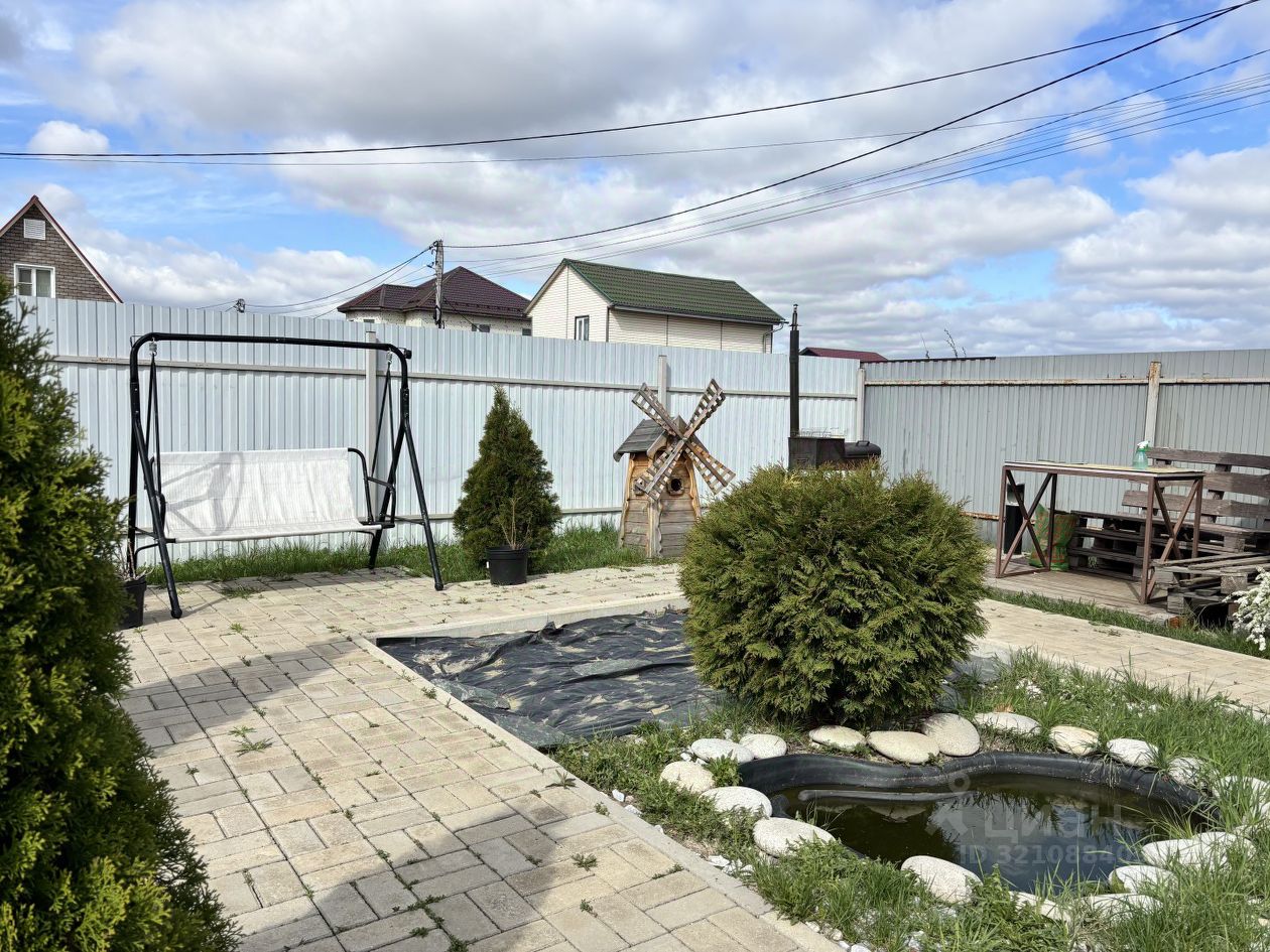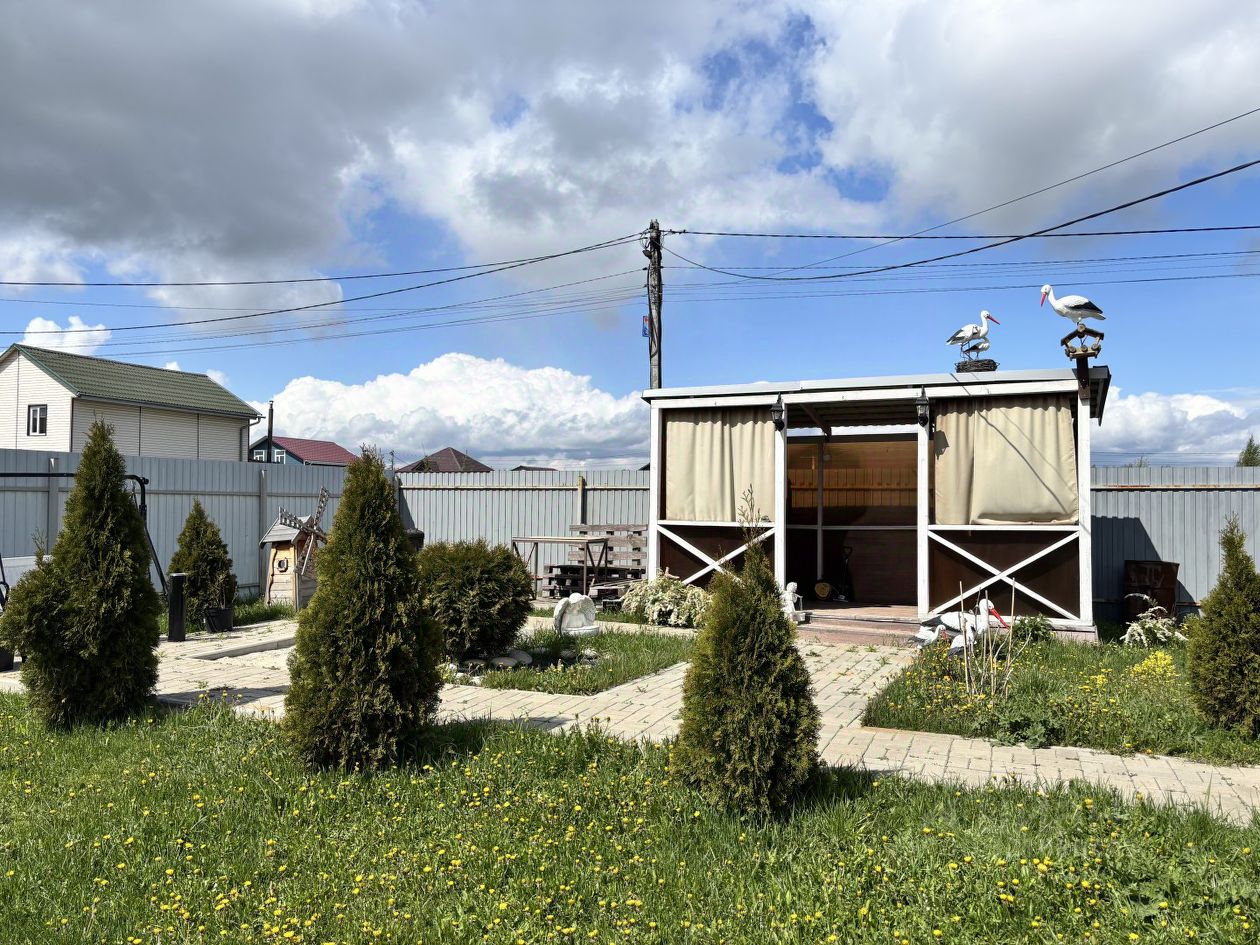 На участке расположена беседка, теплица, мангальная зона, качельки и декоративный пруд.