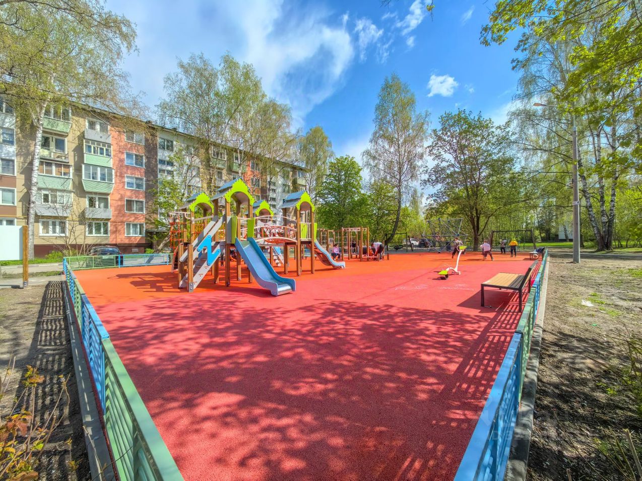 Двор зеленый. Ухоженный. Много парковочных мест. Во дворе современная детская площадка.