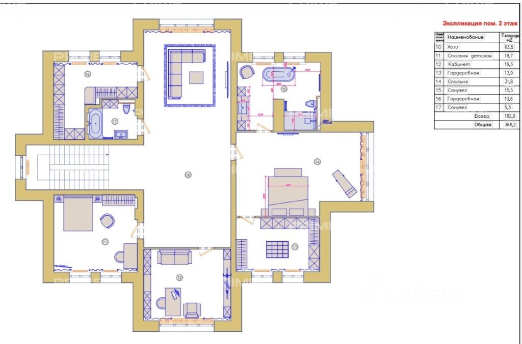 2-й этаж: Гостиная с домашним кинотеатром, мастер-блок с санузлом и гардеробной, кабинет, спальня, санузел, гардеробная.