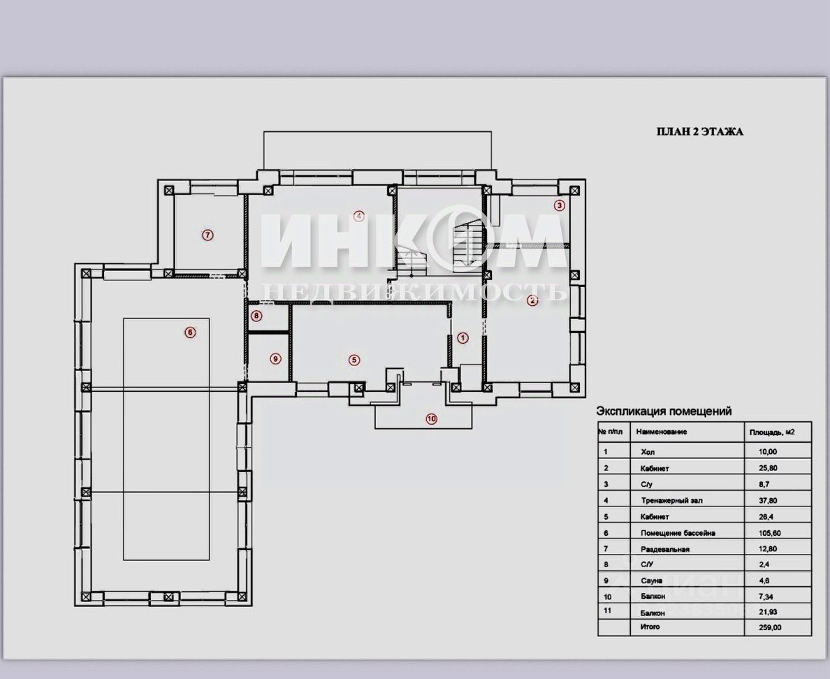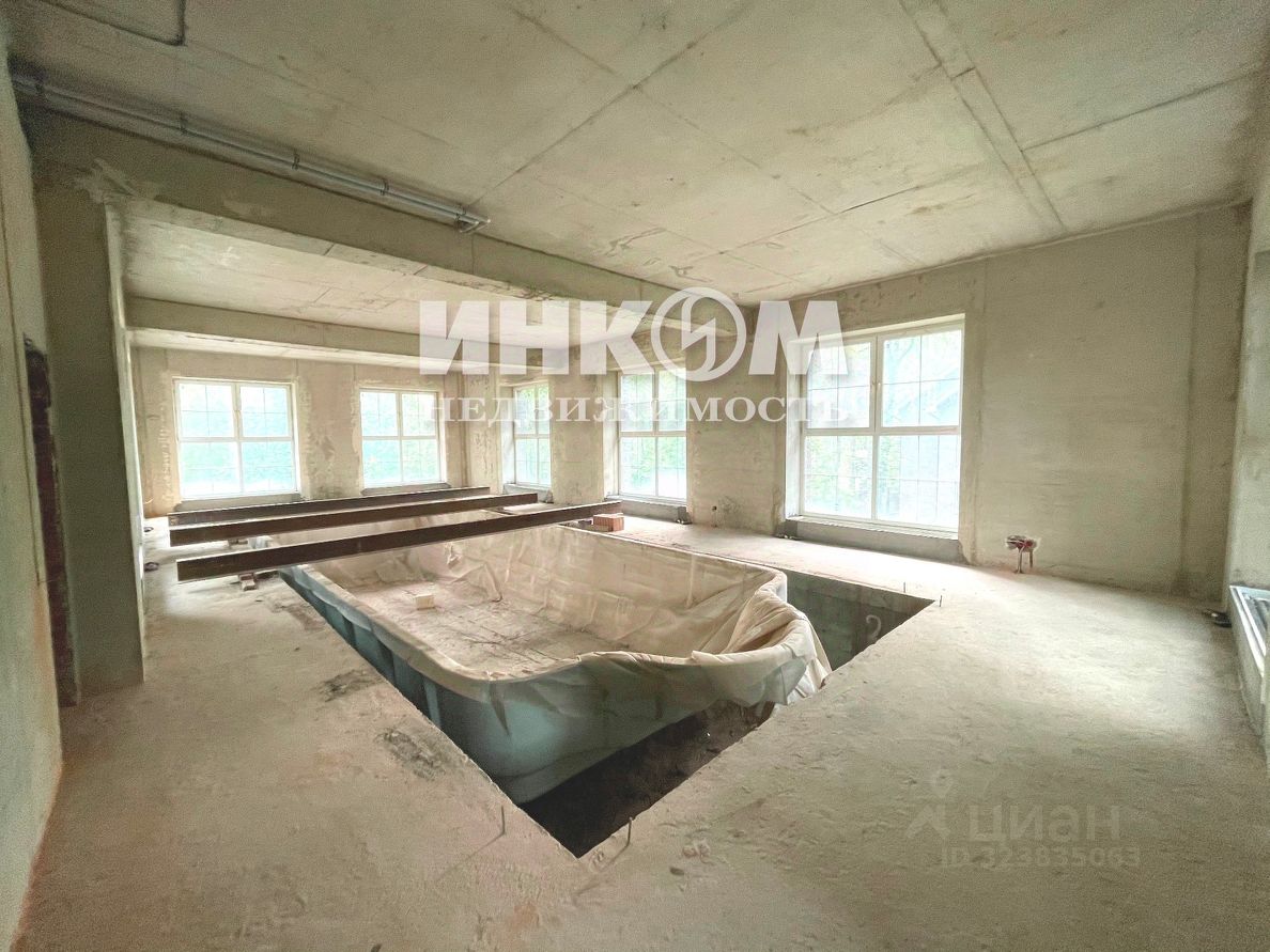 Планировка основного дома: 1 этаж: прихожая, гостевой санузел, постирочная, кухня, гардеробная, кинотеатр, гостиная-столовая, хозяйственный блок, гараж на 2 машины. 2 этаж: холл, кабинет, санузел, тренажерный зал, комната, бассейн площадью 104 кв. м (чаша бассейна - стеклопластик, покрытые gelcoat), раздевалка, санузел, сауна. 3 этаж: холл, гостиная-столовая, 3 спальни, 3 санузла, терраса. Мансарда - площадью 100 кв. м.