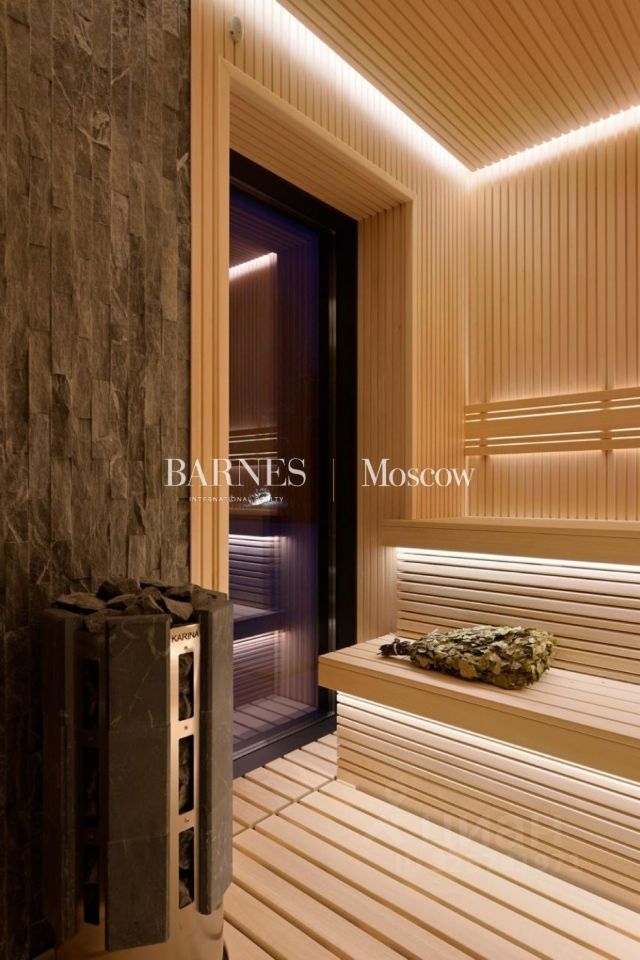 Планировка: 1 этаж: холл, гардеробная, гостиная-столовая-кухня с выходом на крытую террасу, рабочая кухня, СПА-зона: сауна, раздевалка, комната отдыха, с/у, выход на террасу, гостевая спальня с гардеробной, с/у и выходом на террасу, с/у, квартира для персонала с индивидуальным входом, котельная, навес на 2 м/м, 2 этаж: холл, мастер-спальня с двумя гардеробными, ванной комнатой, с/у и террасой, 3 спальни с с/у.