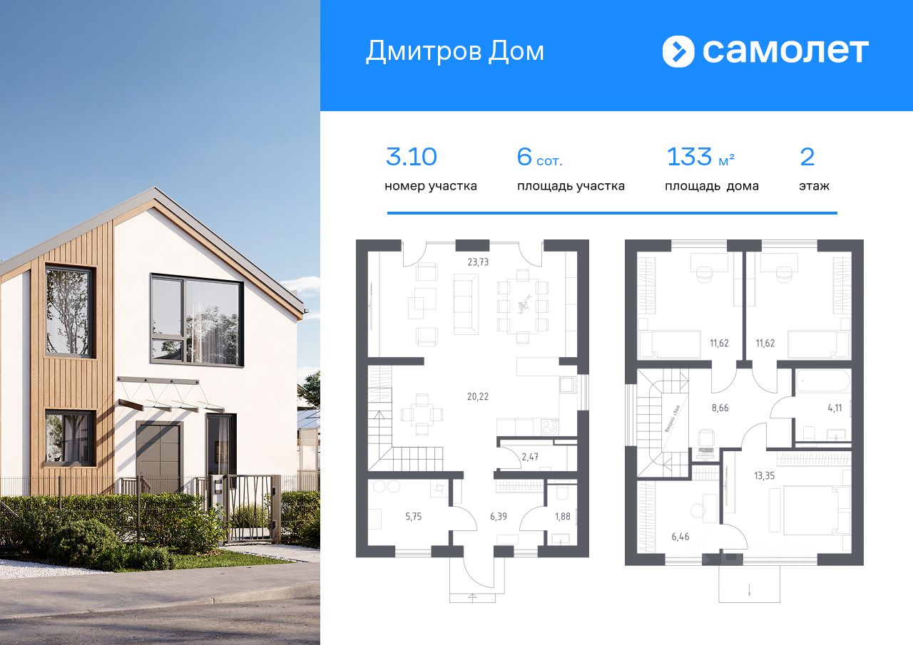 В продаже дом площадью 133 м2 на участке 5.97 от застройщика ''Самолет'' в загородном проекте ''Дмитров Дом''. Функциональная планировка, большие окна и высокие потолки. Дом без отделки.