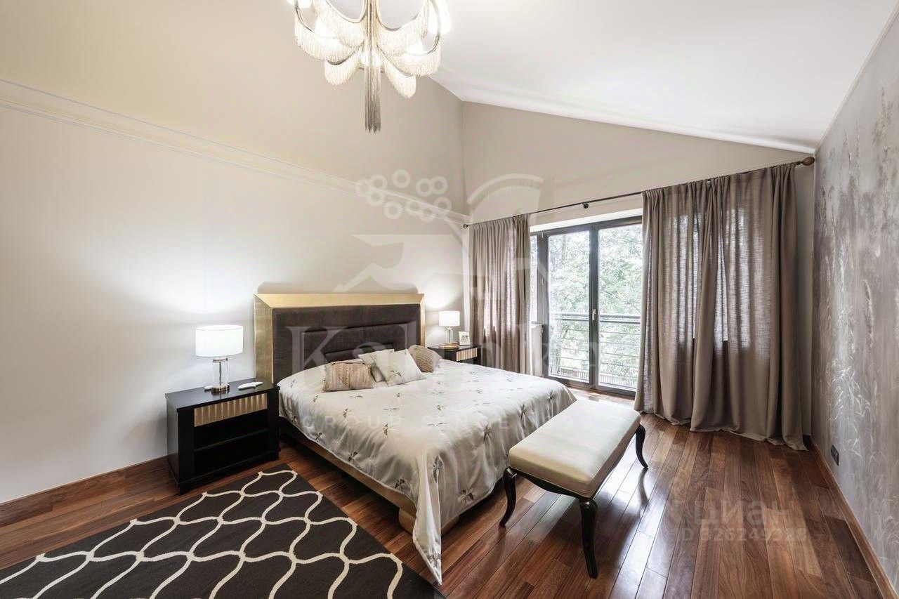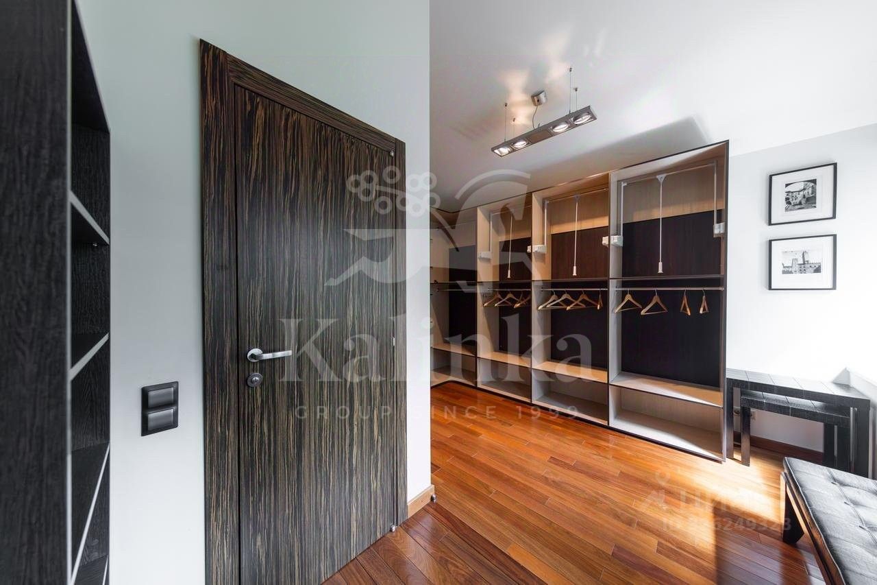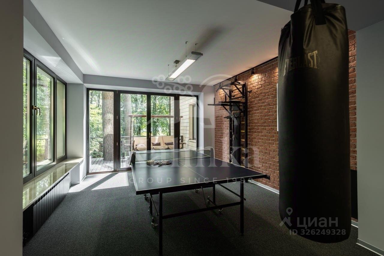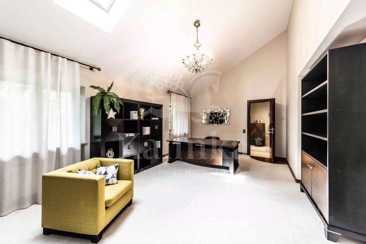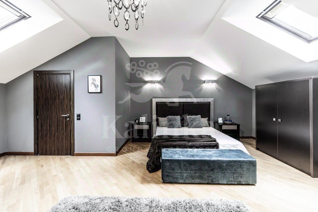 Планировка: Цоколь: сауна, душевая, комната отдыха/раздевалка, бассейн, гараж, 2 с/у, 1 этаж: холл с камином, гардеробная, с/у, кухня, столовая, кладовая/постирочная, гостиная, спортзал, с/у, терраса, 2 этаж: блок для персонала с отдельным входом (спальня, кухня), холл, спальня с с/у и ванной на втором этаже, кабинет, спальня с кабинетом и с/у, балконы, Мансарда: комната отдыха, с/у с душем, спальня с балконом.