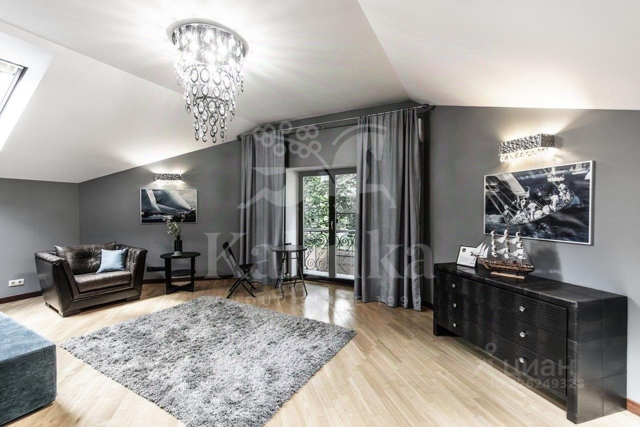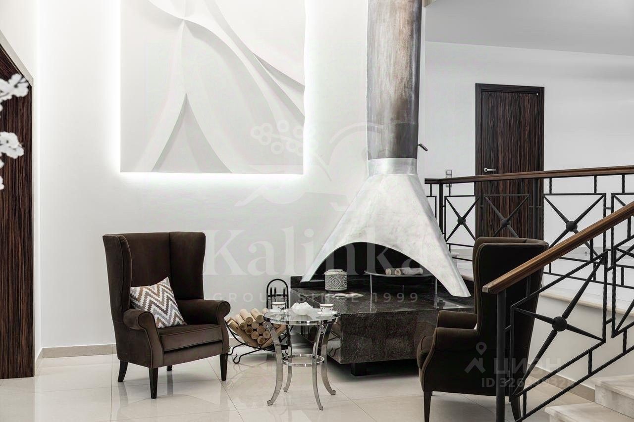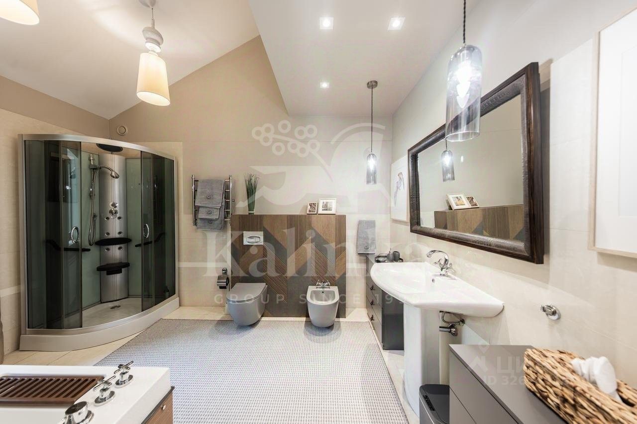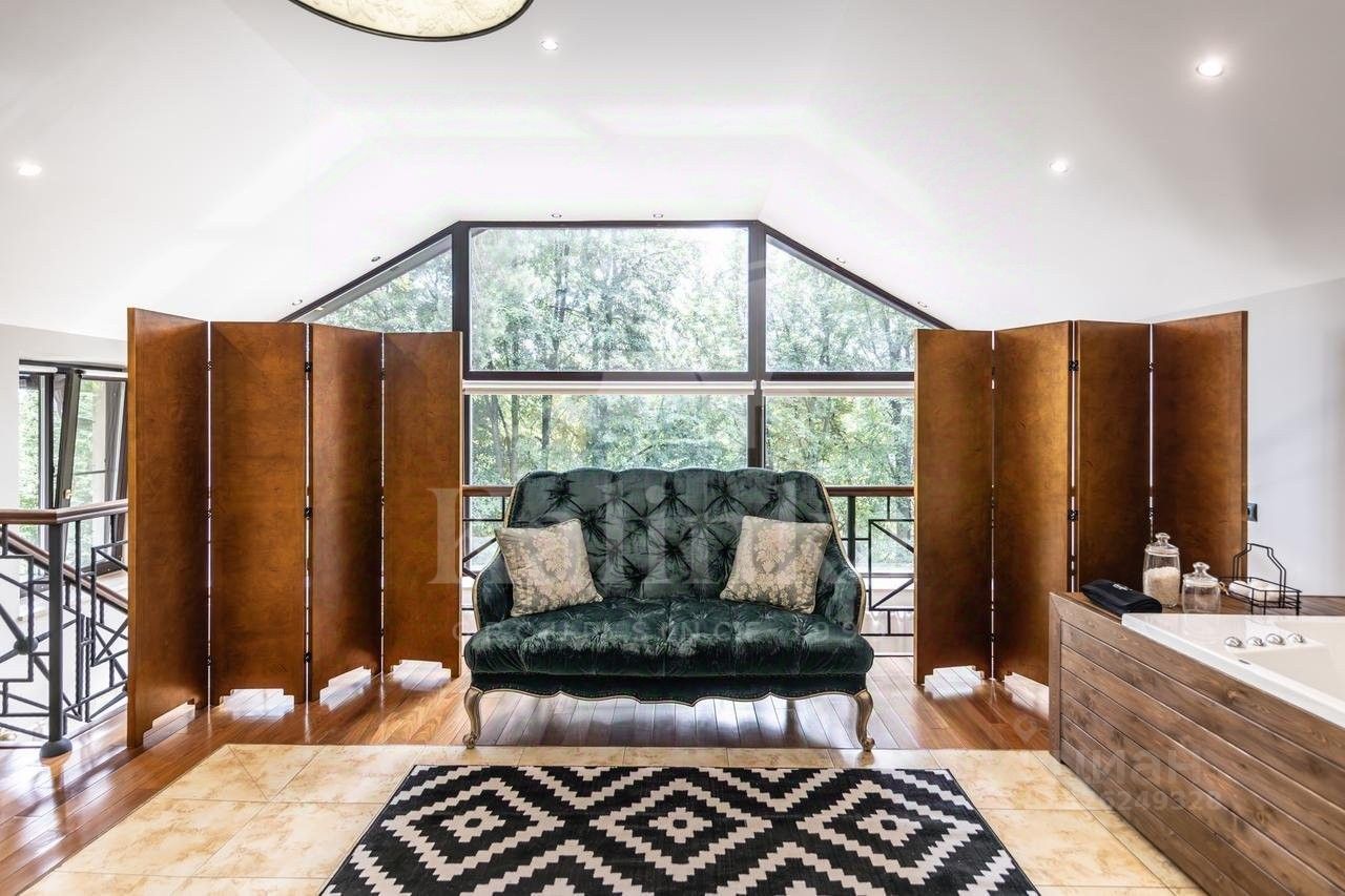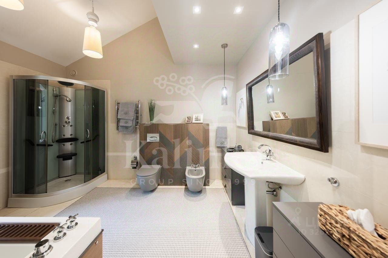 Планировка: Цоколь: сауна, душевая, комната отдыха/раздевалка, бассейн, гараж, 2 с/у, 1 этаж: холл с камином, гардеробная, с/у, кухня, столовая, кладовая/постирочная, гостиная, спортзал, с/у, терраса, 2 этаж: блок для персонала с отдельным входом (спальня, кухня), холл, спальня с с/у и ванной на втором этаже, кабинет, спальня с кабинетом и с/у, балконы, Мансарда: комната отдыха, с/у с душем, спальня с балконом.