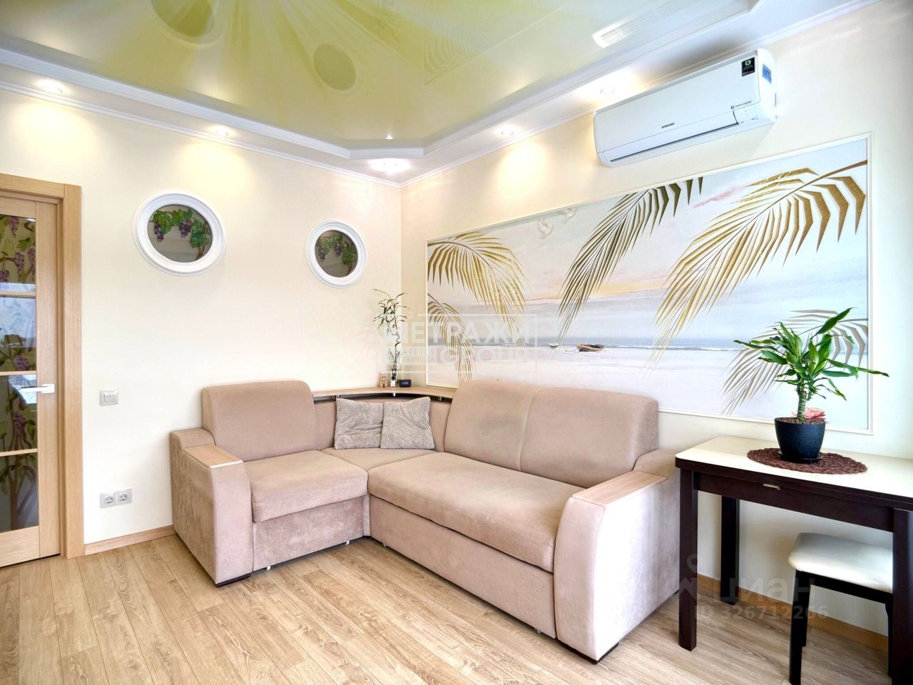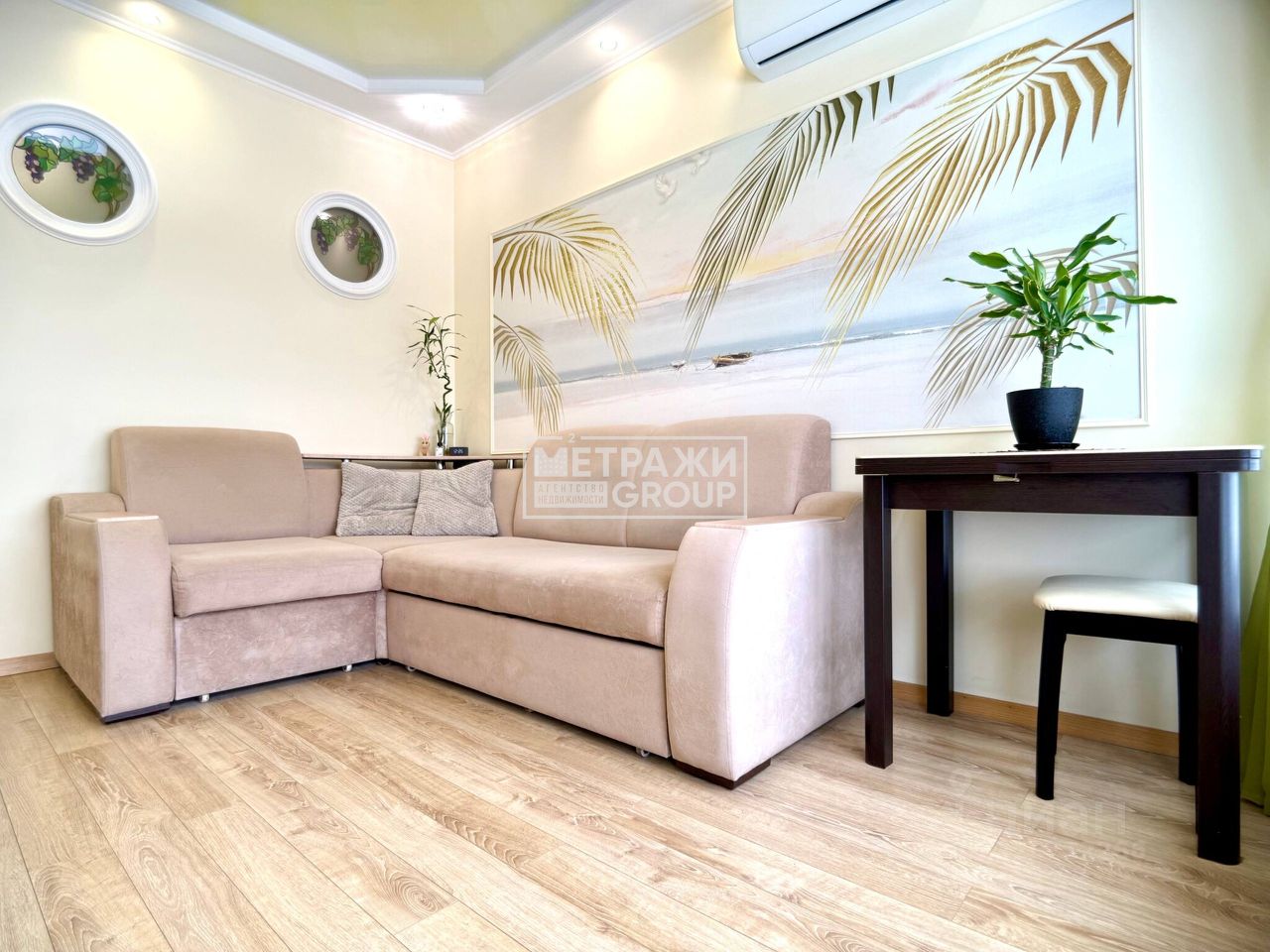 Насладитесь элегантностью испанского керамогранита во входной зоне и теплом натурального дуба в жилой комнате. Продуманное зонирование создает уютную атмосферу, разделяя пространство на функциональные кухню и спальную зону.